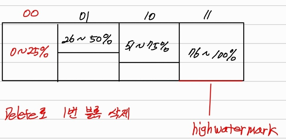 - 1번 블록을 마지막으로 작업했다고해서 HWM의 위치는 바뀌지않고 값이 다차서 다음 블록을 만들어야할 때만 HWM이 바뀐다.