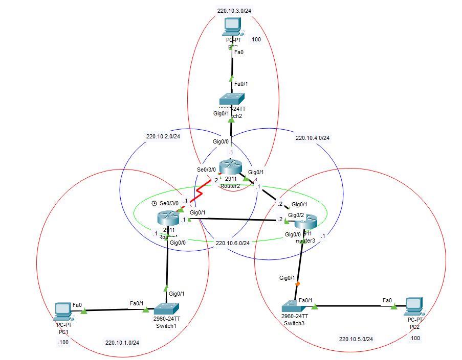 위의 그림은 R3 라우터에서 네트워크를 찾는 경우 - 위의 그림은 라우터3에서 220.10.2.0/24 네트워크를 찾기위해 220.10.6.1과 220.10.4.1홉을 통해 가는 경우입니다.