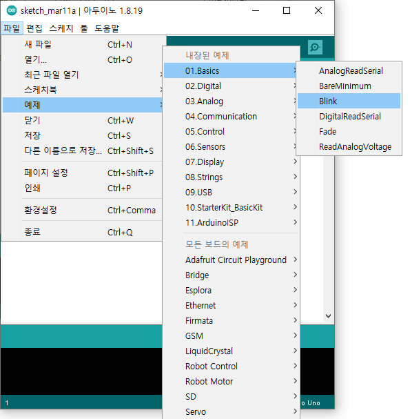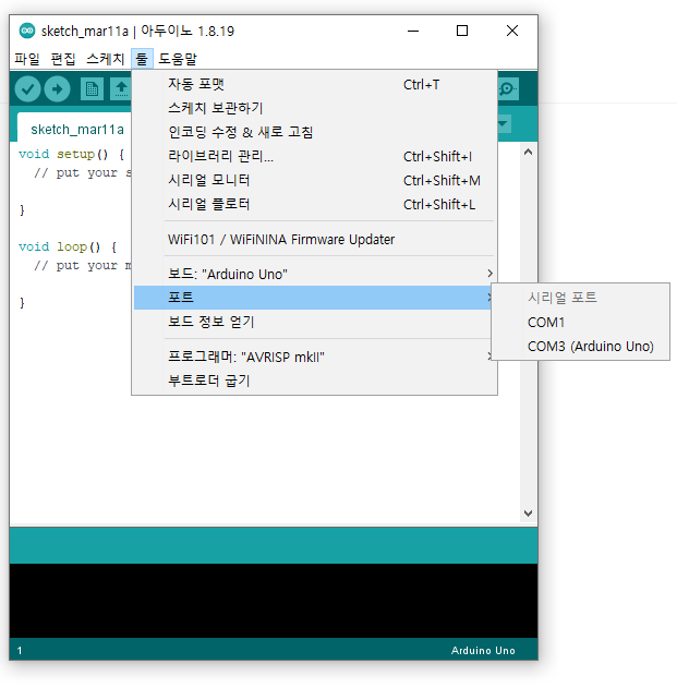 연결 확인 : 툴 -> 포트로 아두이노 Uno가 연결되었는지 확인