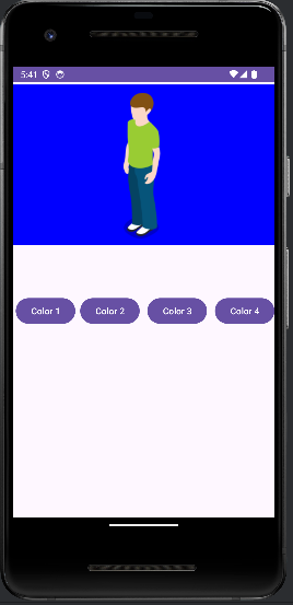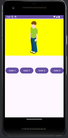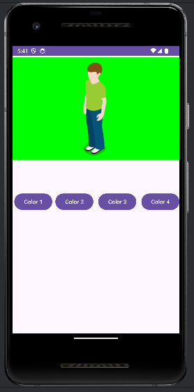 <?xml version="1.0" encoding="utf-8"?> <androidx.constraintlayout.widget.ConstraintLayout xmlns:android="http://schemas.android.com/apk/res/android" xmlns:app="http://schemas.android.com/apk/res-auto" xmlns:tools="http://schemas.android.com/tools" android:layout_width="match_parent" android:layout_height="match_parent" tools:context=".MainActivity"> <ImageView android:id="@+id/clothingImageView" android:layout_width="match_parent" android:layout_height="252dp" android:layout_marginTop="4dp" app:layout_constraintEnd_toEndOf="parent" app:layout_constraintHorizontal_bias="0.0" app:layout_constraintStart_toStartOf="parent" app:layout_constraintTop_toTopOf="parent" app:srcCompat="@drawable/boy_img" /> <Button android:id="@+id/colorButton1" android:layout_width="wrap_content" android:layout_height="wrap_content" android:layout_marginStart="4dp" android:layout_marginTop="79dp" android:text="Color 1" app:layout_constraintEnd_toStartOf="@+id/colorButton2" app:layout_constraintHorizontal_chainStyle="spread_inside" app:layout_constraintStart_toStartOf="parent" app:layout_constraintTop_toBottomOf="@+id/clothingImageView" /> <Button android:id="@+id/colorButton2" android:layout_width="wrap_content" android:layout_height="wrap_content" android:layout_marginEnd="5dp" android:text="Color 2" app:layout_constraintBaseline_toBaselineOf="@+id/colorButton1" app:layout_constraintEnd_toStartOf="@+id/colorButton3" app:layout_constraintStart_toEndOf="@+id/colorButton1" /> <Button android:id="@+id/colorButton3" android:layout_width="wrap_content" android:layout_height="wrap_content" android:layout_marginEnd="5dp" android:text="Color 3" app:layout_constraintEnd_toStartOf="@+id/colorButton4" app:layout_constraintStart_toEndOf="@+id/colorButton2" app:layout_constraintTop_toTopOf="@+id/colorButton2" /> <Button android:id="@+id/colorButton4" android:layout_width="wrap_content" android:layout_height="wrap_content" android:text="Color 4" app:layout_constraintBaseline_toBaselineOf="@+id/colorButton3" app:layout_constraintEnd_toEndOf="parent" app:layout_constraintStart_toEndOf="@+id/colorButton3" /> </androidx.constraintlayout.widget.ConstraintLayout>JAVA