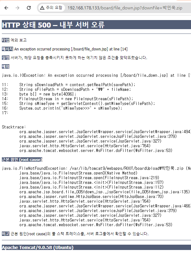 cd /var/lib/tomcat9/webapps/ROOT/board vi file_down.jsp String sFilePath = sDownloadPath + "\\" + fileName;를 String sFilePath = sDownloadPath + "/" + fileName;로 변경- '\\'는 Windows에서 사용하는 경로 구분자