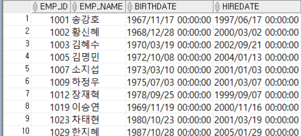-- Y_EMP 테이블에서 사원번호, 이름, 생년월일, 입사일을 조회하여 현재날짜 형식을 확인