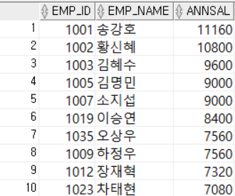 -- 사원번호, 이름, 연봉(SALARY*12)을 조회하는데 연봉을 기준으로 내림차순 정렬하여 출력한다.