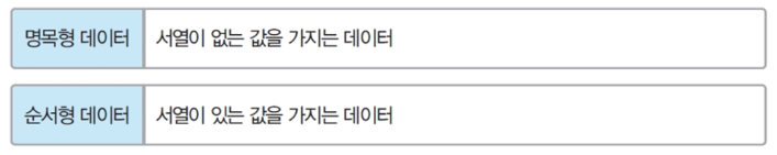 - 질적 데이터라고도 함(크기 비교와 산술 연산 X)