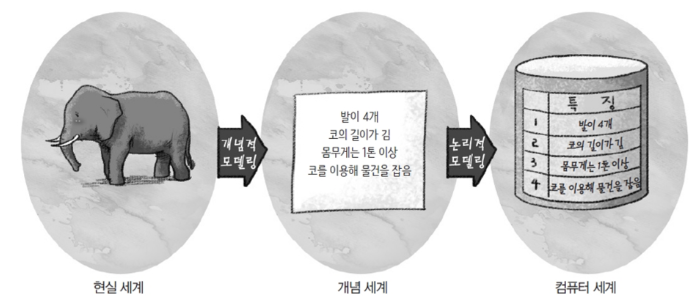 - 사람의 머리로 이해할 수 있도록 현실 세계를 개념적 모델링하여