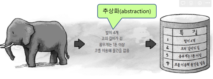 - 현실 세계의 중요 데이터를 추출하여 개념 세계로 옮기는 작업