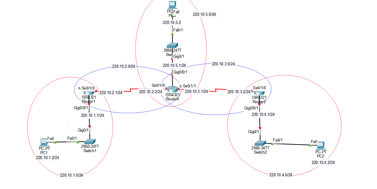 Router>en Router#conf t Enter configuration commands, one per line. End with CNTL/Z. Router(config)#int se0/1/0 Router(config-if)#ip add 220.10.2.2 255.255.255.0 Router(config-if)#clock rate 64000 // 시리얼포트는 clockrate를 설정해주어야합니다. Router(config-if)#no shutRouter(config)#int g0/0/1 Router(config-if)#ip add 220.10.5.1 255.255.255.0 Router(config-if)#no shutRouter(config)#int se0/1/1 Router(config-if)#ip add 220.10.3.1 255.255.255.0 Router(config-if)#clock rate 64000 Router(config-if)#no shutR1
