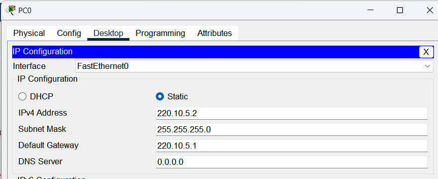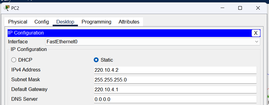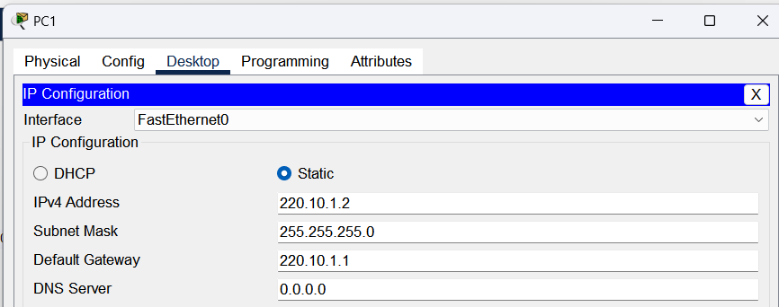 Router>en Router#conf t Enter configuration commands, one per line. End with CNTL/Z. Router(config)#ip route 220.10.1.0 255.255.255.0 220.10.2.1 Router(config)#ip route 220.10.4.0 255.255.255.0 220.10.3.2 Router(config)#exitR3