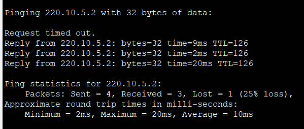 Router>en Router#conf t Enter configuration commands, one per line. End with CNTL/Z. Router(config)#ip route 220.10.1.0 255.255.255.0 220.10.3.1 Router(config)#ip route 220.10.2.0 255.255.255.0 220.10.3.1 Router(config)#ip route 220.10.5.0 255.255.255.0 220.10.3.1 Router(config)#exit